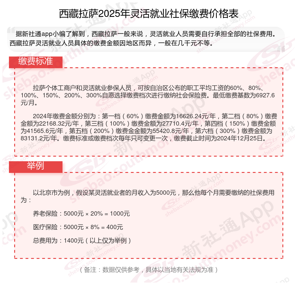 据新社通app数据显示,西藏拉萨企业灵活就业养老保险的缴费基数为:6927.6元。