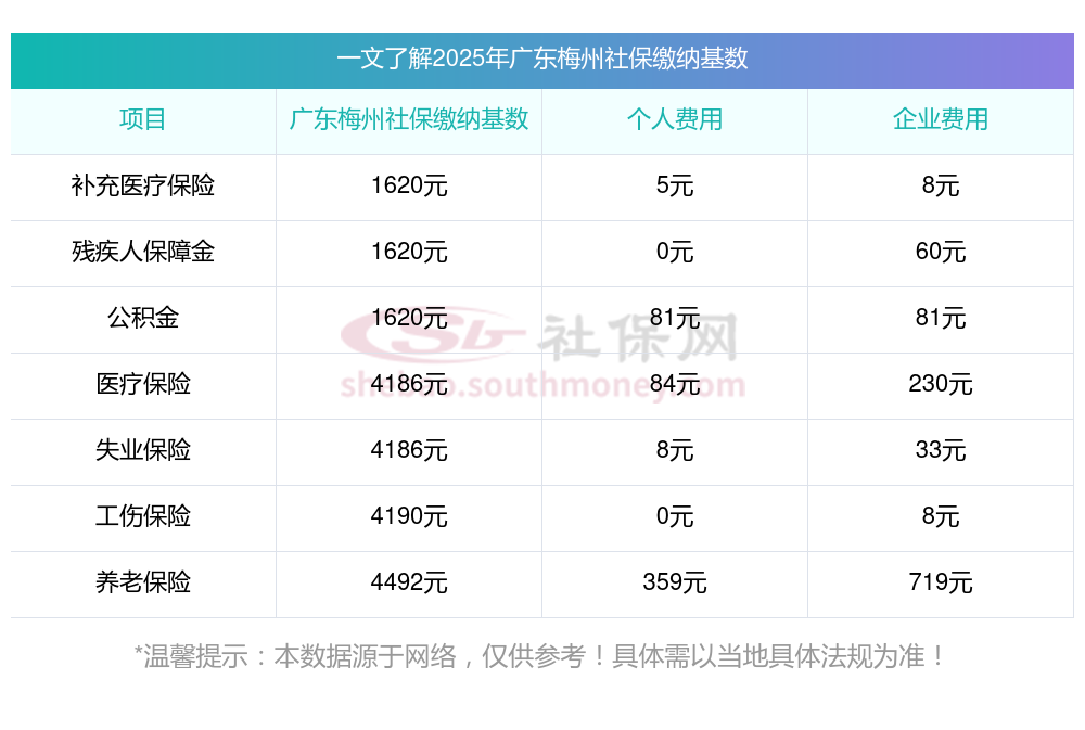 据新社通app显示,广东梅州社保缴费基数2025年最新消息,广东梅州职工社保缴费详情如下: