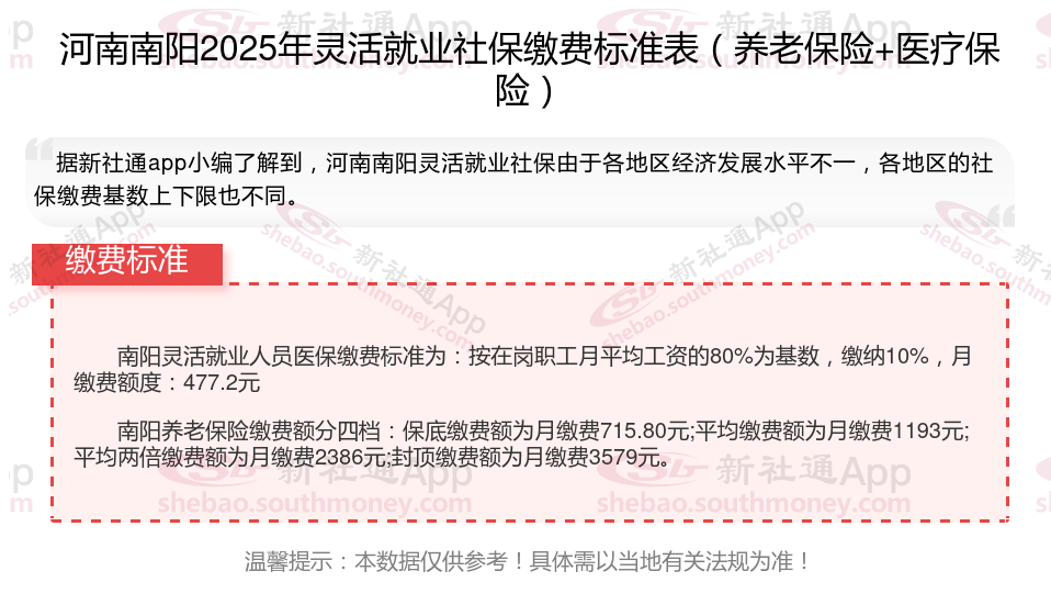 那么,个体户社保是多少钱一个月 河南南阳灵活社保交多少钱?根据新社通app-社保缴费查询工具提供的2025社保缴费标准详情数据: