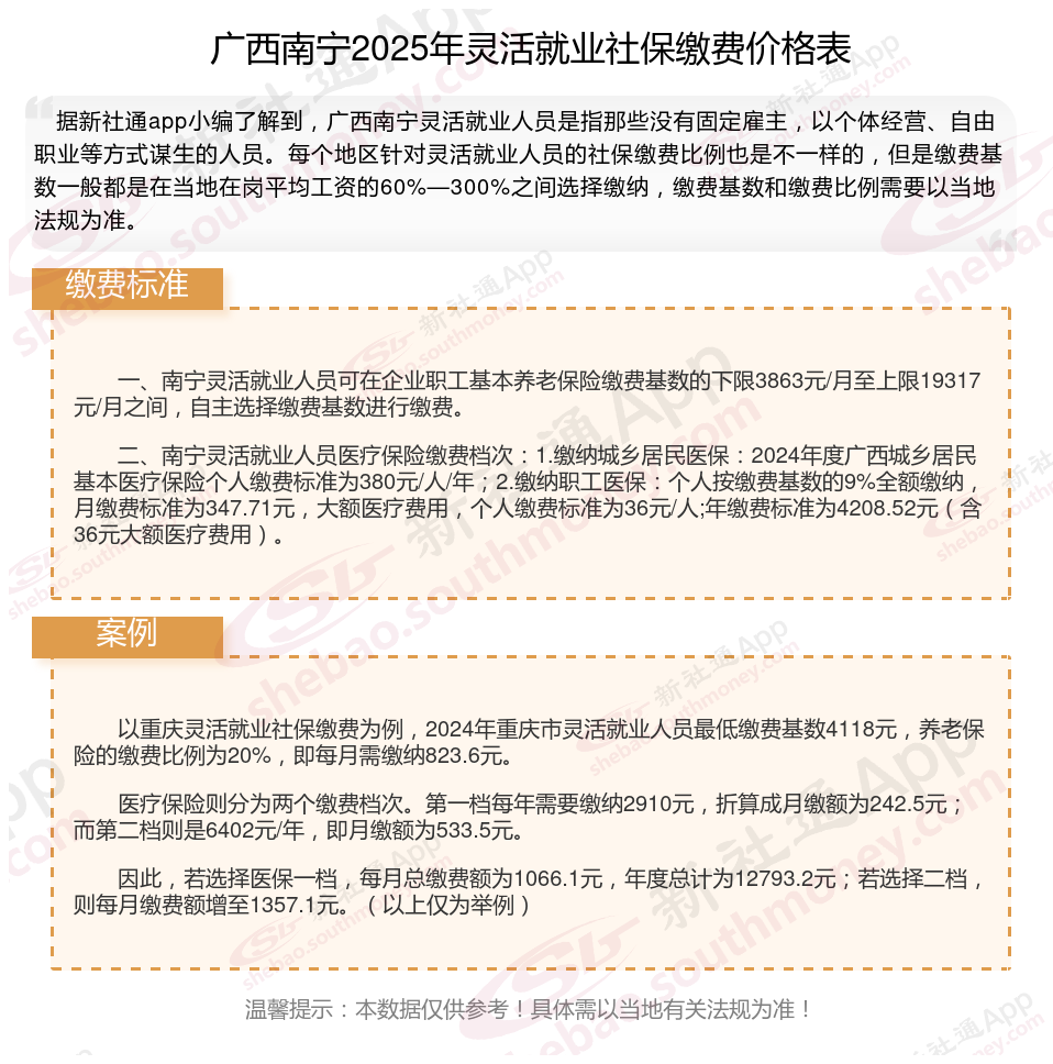 那么,广西南宁灵活就业人员社保多少钱一个月?根据新社通app-社保缴费查询工具提供的2025社保缴费标准详情数据: