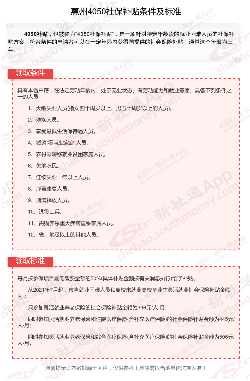 今天聊一下4050补贴的相关内容。4050补贴听起来像是一个针对特定年龄人群的社保补贴。比如女性需年满40周岁,男性需年满50周岁(以申请当年12月31日为截止日期)。那么惠州4050灵活就业困难人员社保补贴多少钱?惠州4050社保补贴可以申请吗?接下来随新社通APP小编具体了解一下4050社保补贴内容。