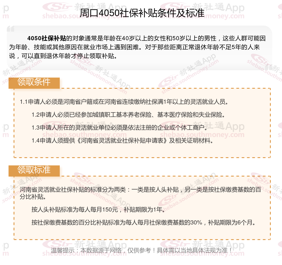 4050补贴需要以灵活就业身份参加职工养老和医疗保险,补贴标准不超过实际缴费的三分之二,最长3年,距离退休不足5年的可延长到退休。补贴对象包括国企下岗人员、低保家庭等。申请流程需要提交身份证、银行账户等。那么周口4050灵活就业社保补贴标准是多少钱?周口4050社保补贴条件是什么?接下来随新社通APP小编了解一下最新资讯。