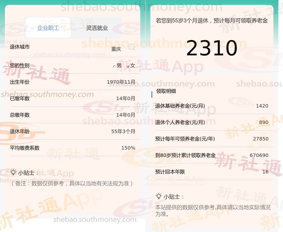 个人基础信息:女性,1970年出生,重庆退休人士,拥有14年的缴费年限,缴费档次为150%。