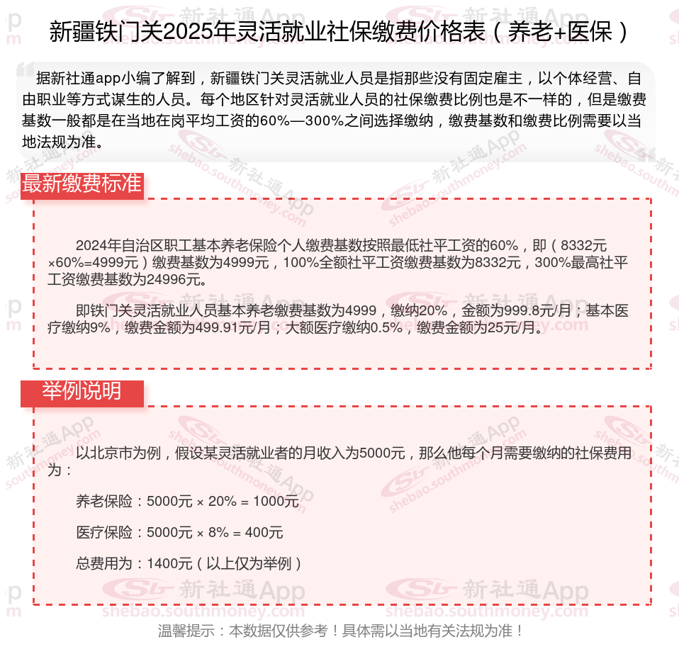据新社通app数据显示,新疆铁门关灵活就业人员养老保险缴费基数2024-2025年最新标准如下: