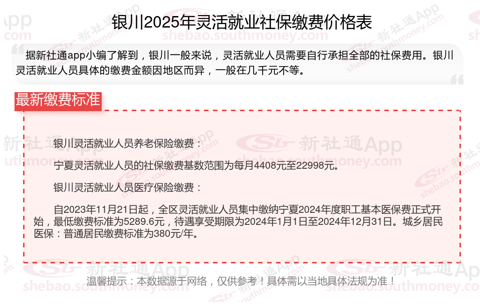 据新社通app数据显示,银川灵活就业养老保险缴费基数2024-2025年最新标准如下: