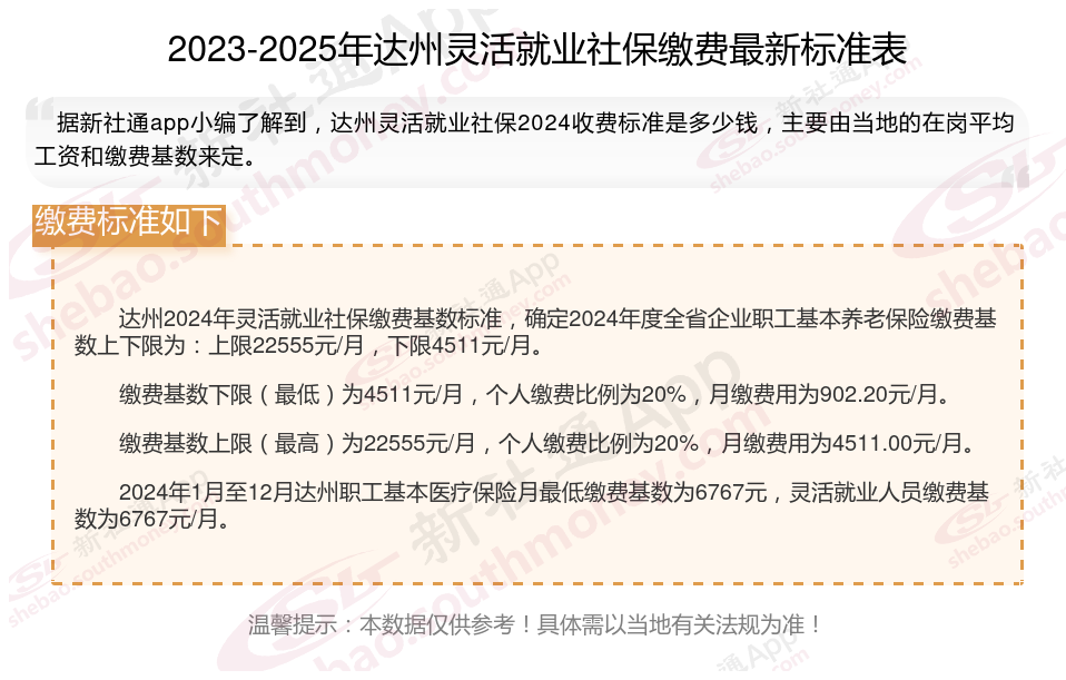 据新社通app数据显示,达州企业灵活就业养老保险的缴费基数为:4511元。