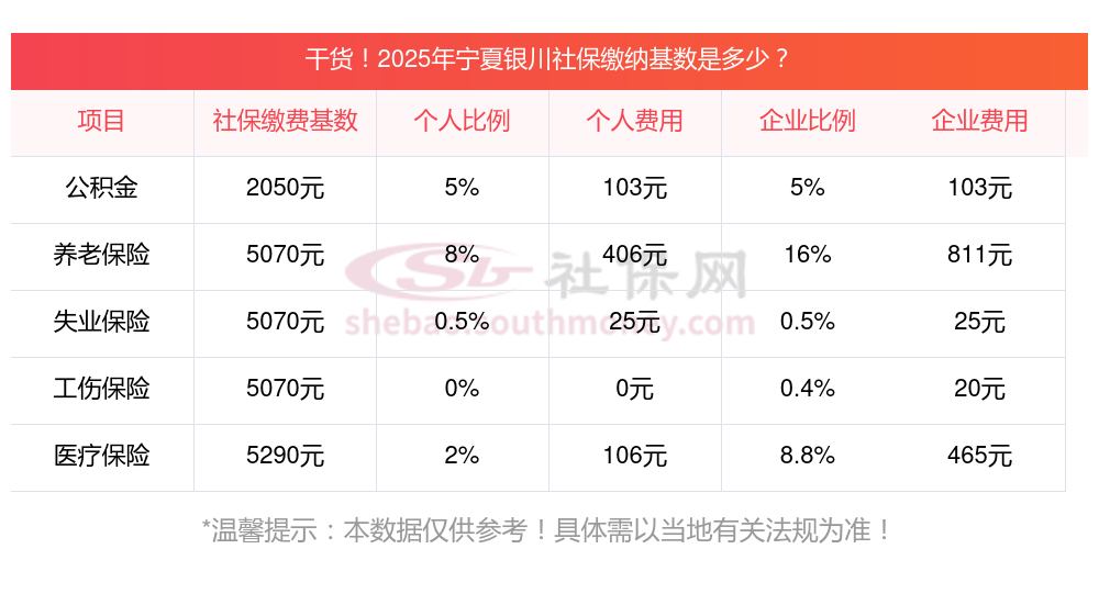(1)据新社通小编了解到,社保缴费基数的确立,主要依靠职工上一年度月平均工资,再依据当地社会平均工资60%-300%的上下限进行调整。 目前,宁夏银川社保缴费基数为:5070.00,个人费用约为:405.6元,企业费用约为:811.2元。