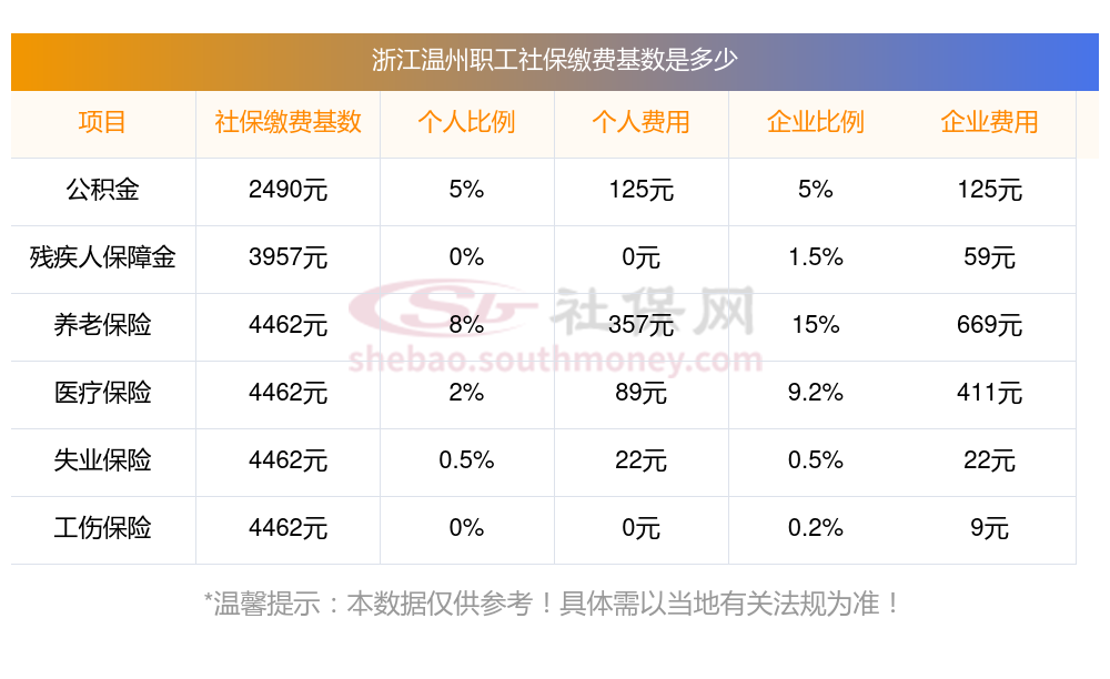 职工社保缴纳和待遇是怎么样的?2025年浙江温州社保缴费标准有变?据新社通app获悉:浙江温州企业职工社保缴费基数为:3579.00元。