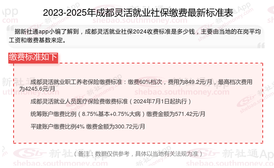 2024-2025年成都灵活就业人员社保缴费标准是多少?社保交完退休能领多少钱?下表是2024-2025年成都社保费用明细参考,根据新社通app-社保缴费查询工具提供的最新数据如下: