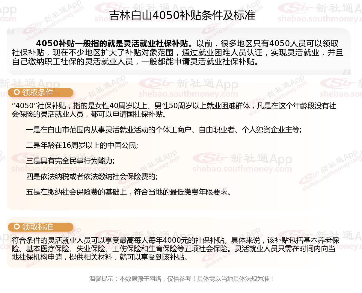 二、2025年吉林白山4050社保补贴标准及条件,最新如下: