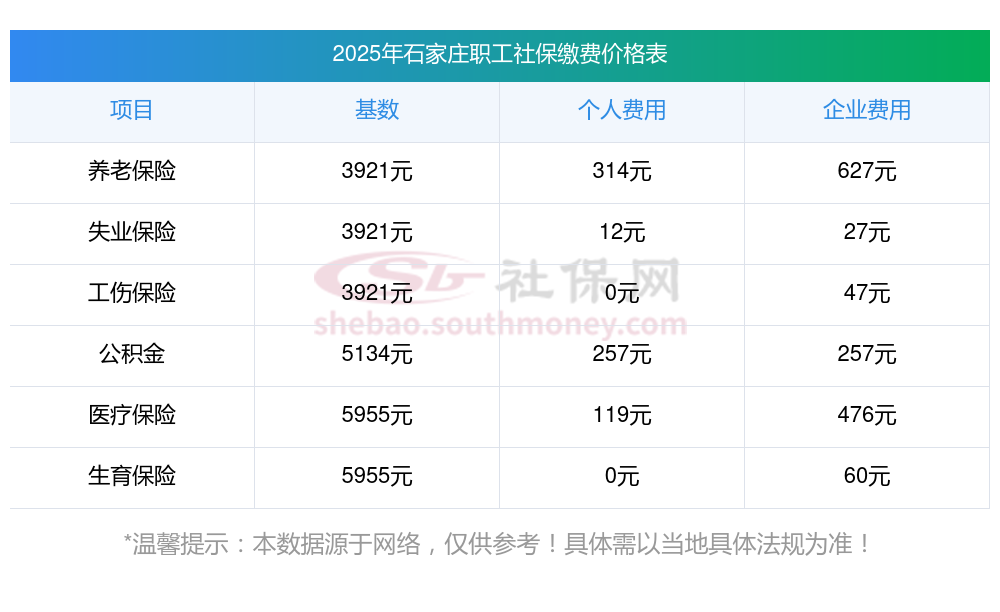 2025年石家庄社保缴费价格标准是多少,2025年石家庄社保缴费多少钱?下表是2025年石家庄社保费用明细参考,新社通app-社保缴费查询工具提供的最新数据如下: