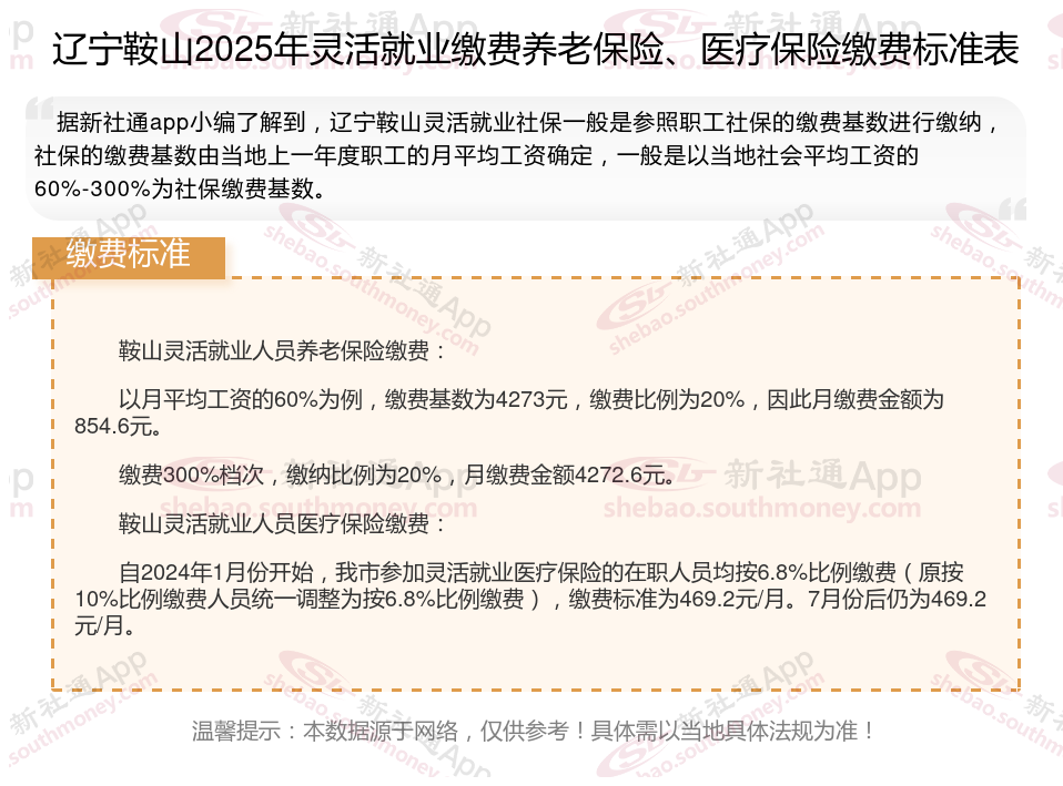 以上就是带来辽宁鞍山灵活就业社保缴费标准相关知识,内容供参考,希望对你有帮助,欢迎关注/下载新社通app解锁更多社保专业资讯。