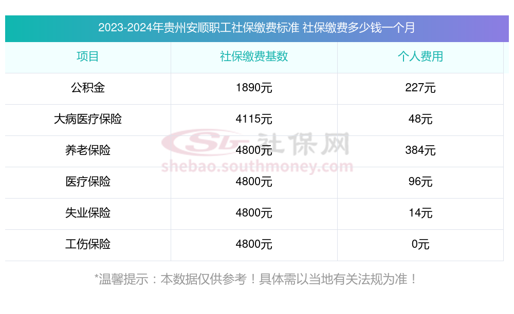 2025年贵州安顺社保缴费多少钱?下表是2024-2025年贵州安顺社保费用明细参考,新社通app-社保缴费查询工具提供的最新数据如下: