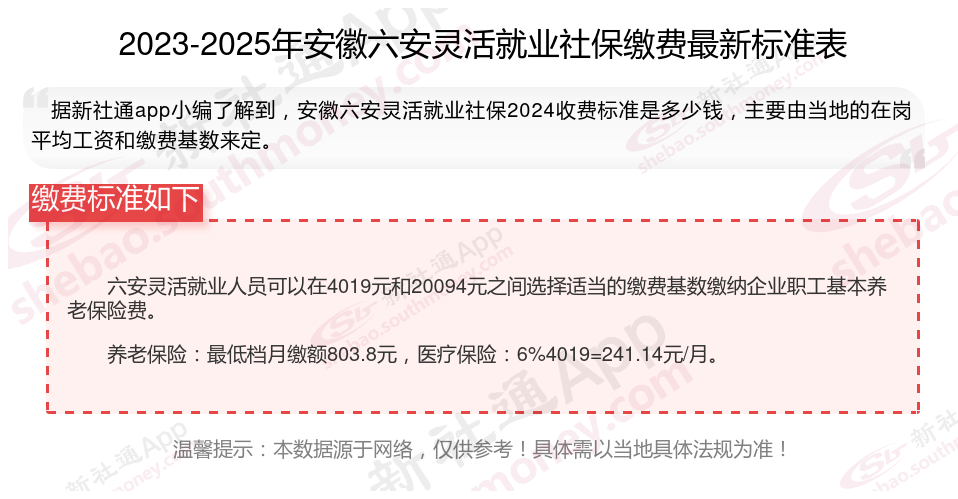 以上就是带来安徽六安灵活就业社保缴费标准相关知识,内容供参考,希望对你有帮助,欢迎关注/下载新社通APP解锁更多社保专业资讯。