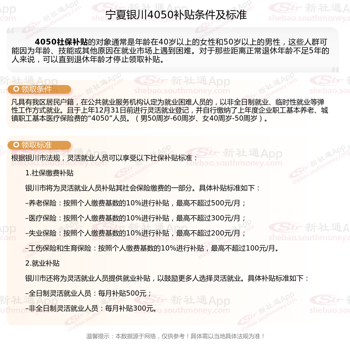 第一、宁夏银川灵活就业4050补贴怎么补贴的,不知道灵活就业4050补贴错过了怎么办?宁夏银川办理4050社保补贴需要哪些手续材料?宁夏银川要拿到4050补贴,其主要申领条件包含这些