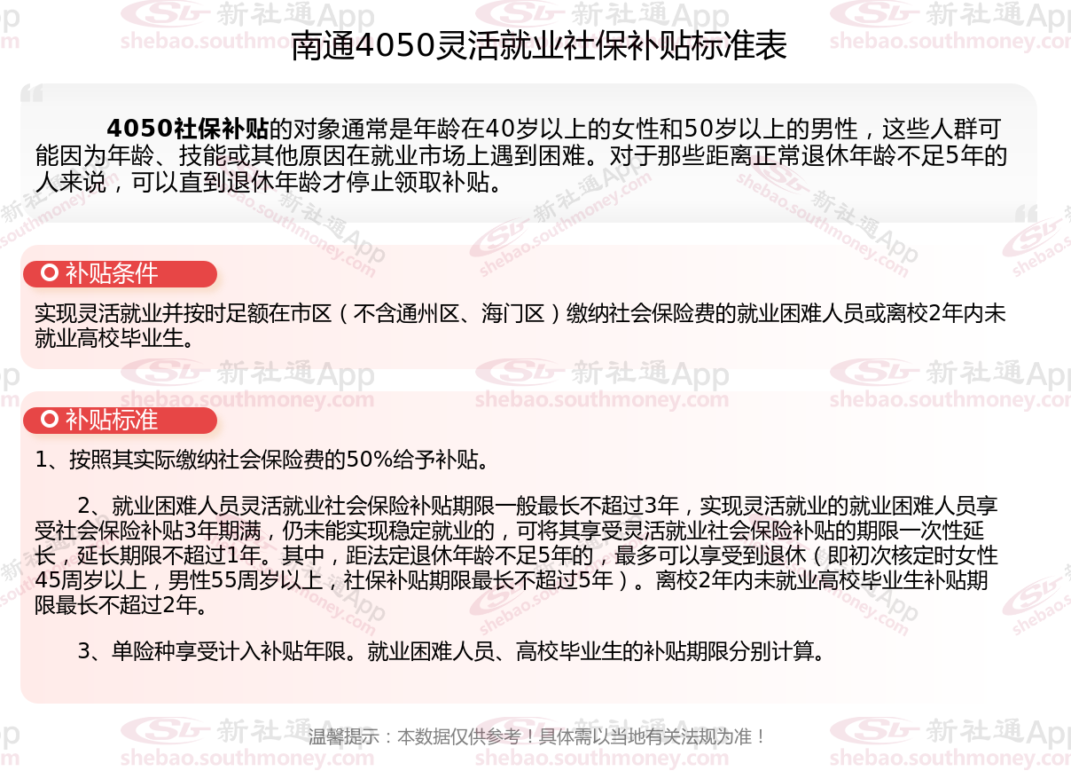 二、2026年南通4050社保补贴标准及条件,最新如下: