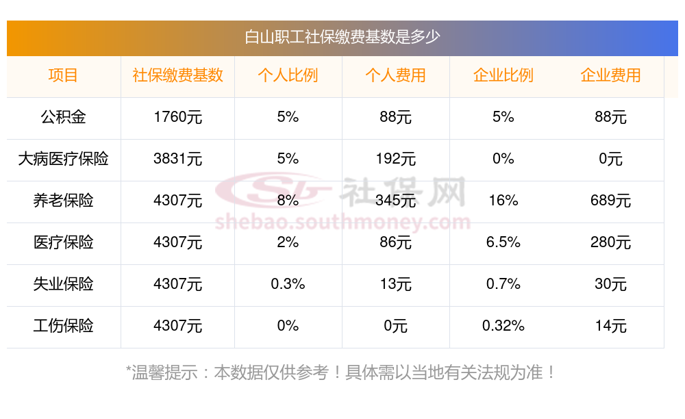 据新社通小编了解到,白山职工社保缴费基数为:4307.10,个人费用约为:344.568元,企业费用约为:689.136元。
