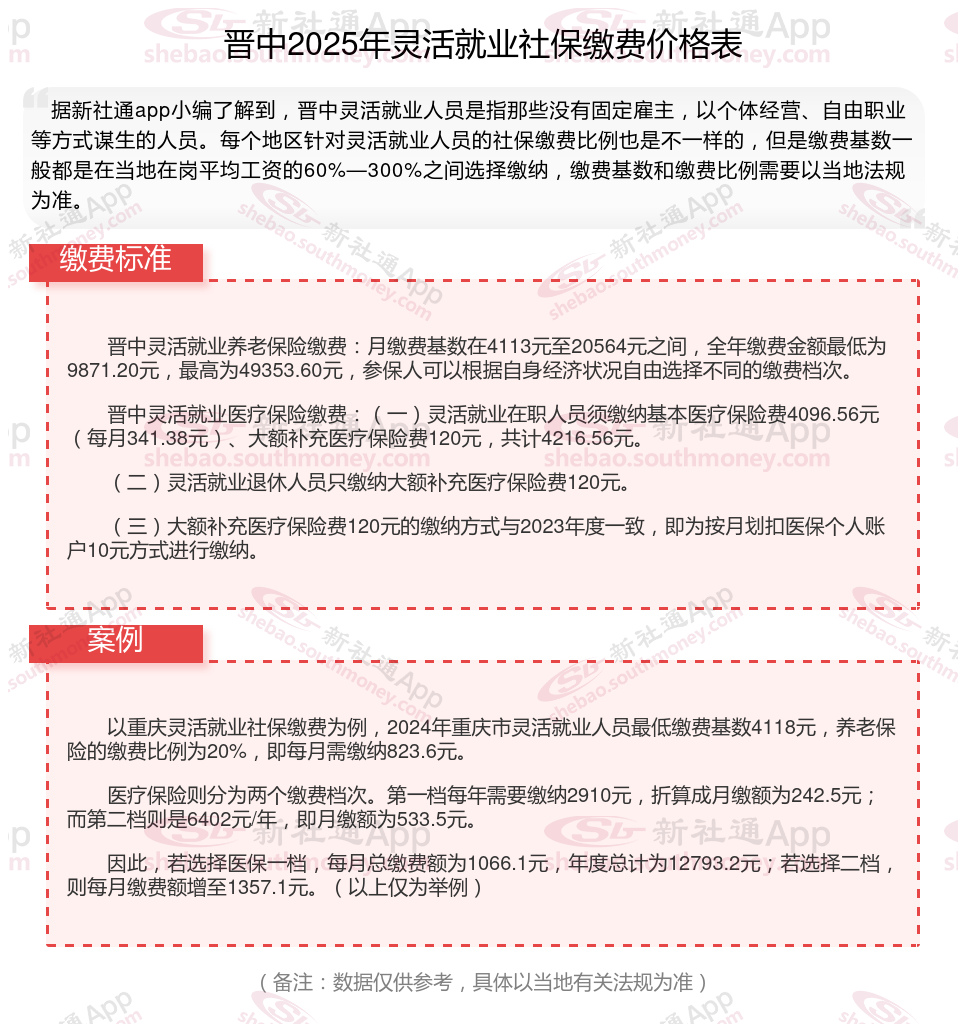 2025年晋中灵活就业人员社保需要交多少钱?灵活就业,作为一种非传统的就业方式,近年来蓬勃发展。为保护这部分人群的权益,国制定了相应的社保缴费法规。2024年,灵活就业社保缴费法规继续完善,涵盖了养老保险、医疗保险、失业保险等多个方面,旨在为灵活就业人员提供全面的社会保证。接下来随新社通APP小编一起来看看。