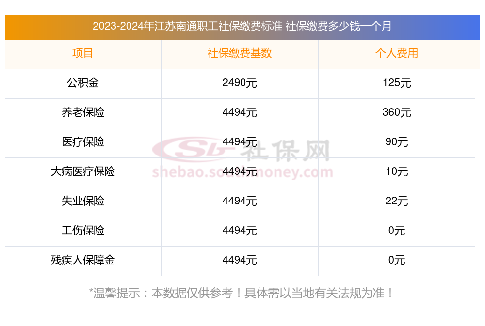 据新社通小编了解到,江苏南通职工社保缴费基数为:4494.00,个人费用约为:359.52元,企业费用约为:719.04元。