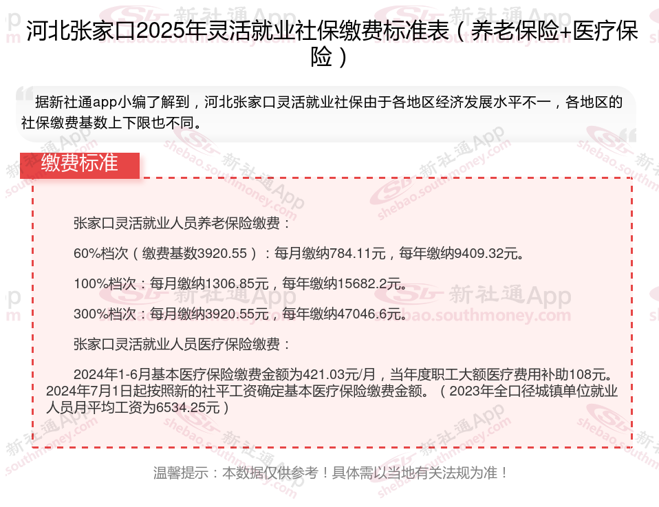 以上就是河北张家口灵活就业社保缴费的全部内容,数据及内容供参考!希望对你有帮助,欢迎关注新社通解锁更多社保专业资讯。