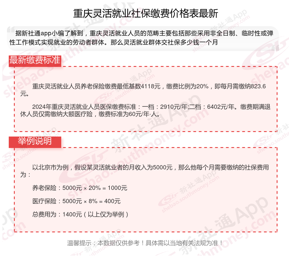 2025年重庆灵活就业人员社保需要交多少钱?灵活就业,作为一种非传统的就业方式,近年来蓬勃发展。为保护这部分人群的权益,国制定了相应的社保缴费法规。2024年,灵活就业社保缴费法规继续完善,涵盖了养老保险、医疗保险、失业保险等多个方面,旨在为灵活就业人员提供全面的社会保证。接下来随新社通APP小编一起来看看。