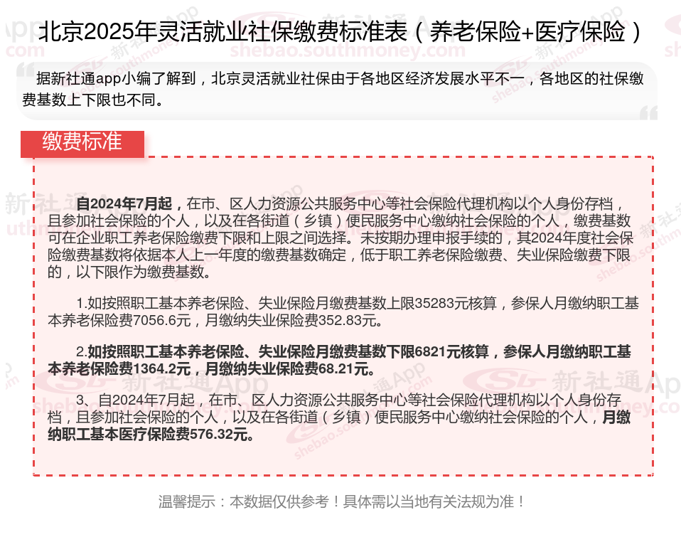 一、2024-2025年北京灵活就业社保缴费标准表 北京灵活就业社保多少钱一个月?