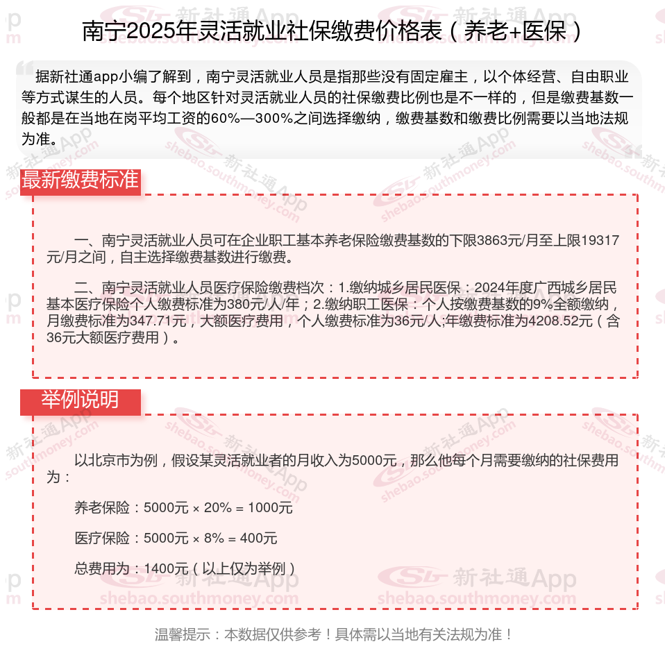 一、2025年南宁灵活就业社保缴费标准表 南宁灵活就业社保多少钱一个月?