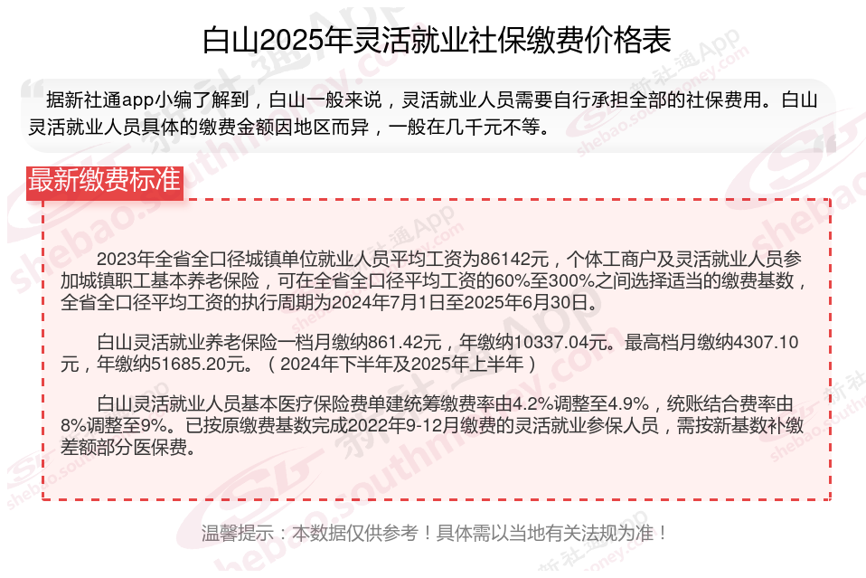 以上就是带来白山灵活就业社保缴费标准相关知识,内容供参考,希望对你有帮助,欢迎关注/下载新社通app解锁更多社保专业资讯。