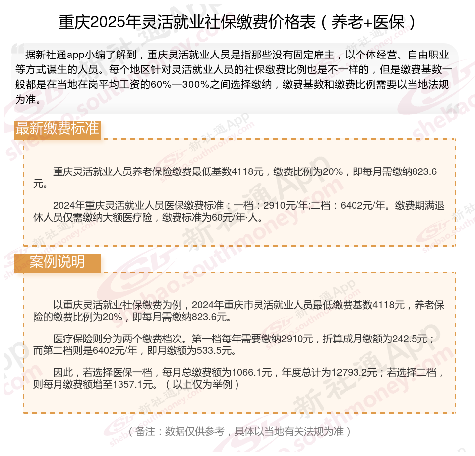 对于灵活就业者来说,社保缴纳是一个非常重要的问题。那么,2025年重庆灵活就业社保怎么交?一个月要交多少呢?领取待遇如何计算的?接下来随新社通APP小编一起了解重庆灵活就业社保缴费具体详情吧。