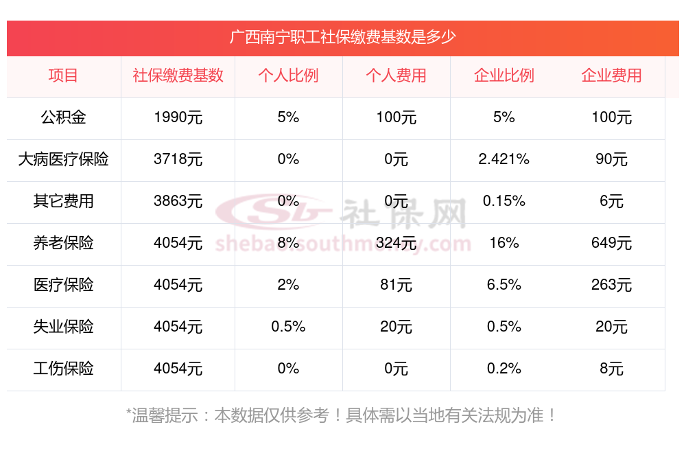 据新社通app获悉:广西南宁企业职工社保缴费基数为:3579.00元,广西南宁社保要多少钱? 2025年个人社保缴费标准表(最低标准)?: