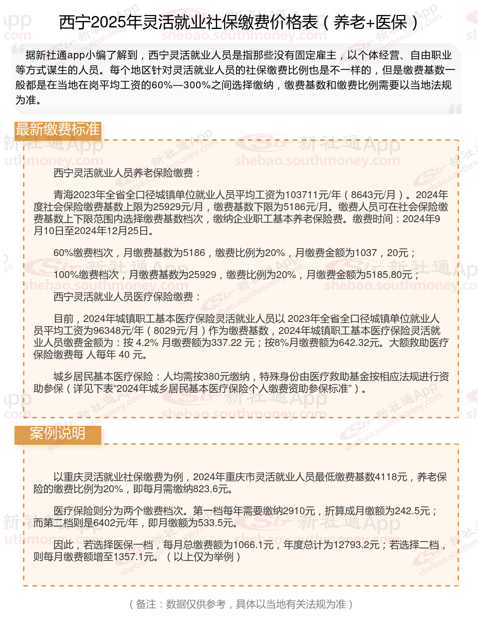 2025年西宁灵活就业人员社保交多少钱,你了解2025年西宁灵活就业人员社保缴费基数及比例吗,据新社通小编了解到,灵活就业社保缴费标准每年都会有所调整,主要体现在缴费基数和缴费比例上。接下来随新社通APP小编一起来看看。