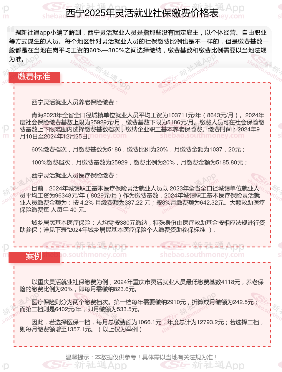 灵活就业社保能抵御疾病、失业、养老等重大风险,避免陷入经济困境。也能享受医保报销、养老金增长等红利。社保是劳动者的法定权利,断缴可能影响购房、落户、子女教育等。接下来随社保君了解一下2025年西宁灵活就业人员社保交多少钱,2025年西宁灵活就业社保缴费标准的详细内容。
