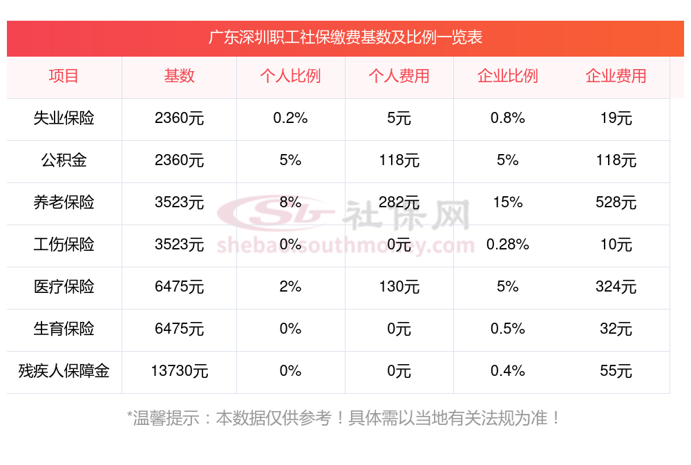 广东深圳职工社保缴费多少钱?广东深圳职工社保缴费基数最新参考为:3579.00,具体如下: