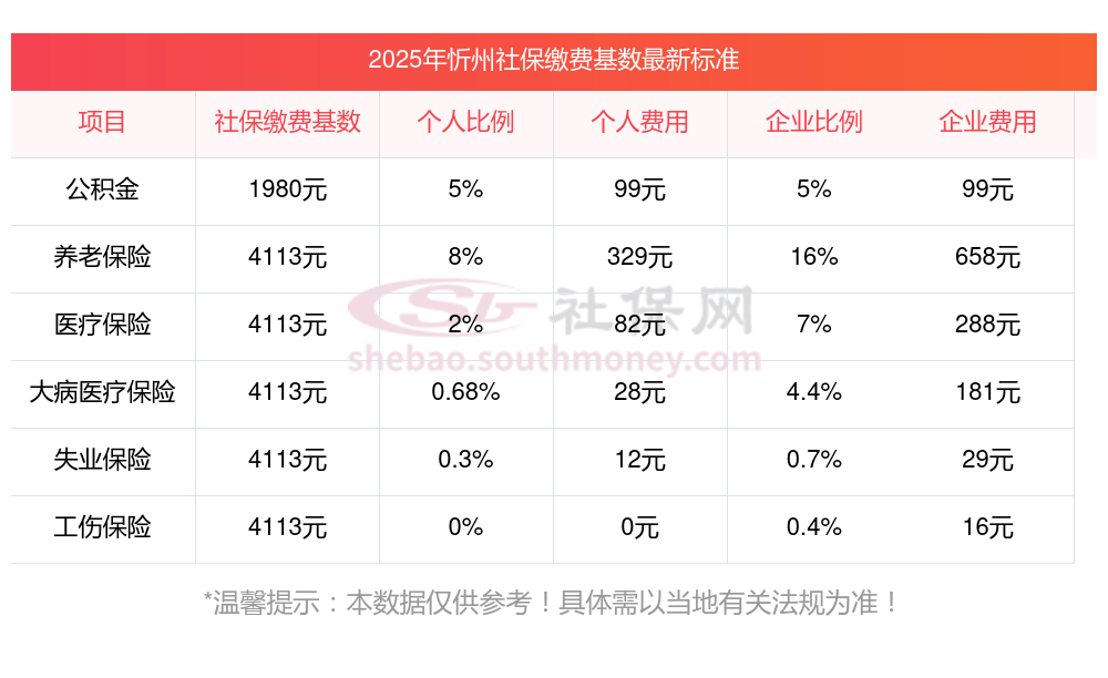 一、据新社通app获悉:忻州企业职工社保缴费基数为:3579.00元,忻州社保缴费标准基数及比例 2025年个人社保缴费标准表(最低标准)?: