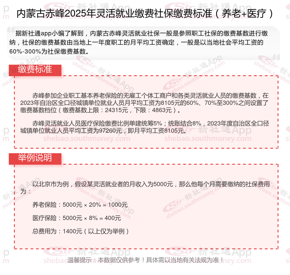 以上就是带来内蒙古赤峰灵活就业社保缴费标准相关知识,内容供参考,希望对你有帮助,欢迎关注/下载新社通app解锁更多社保专业资讯。
