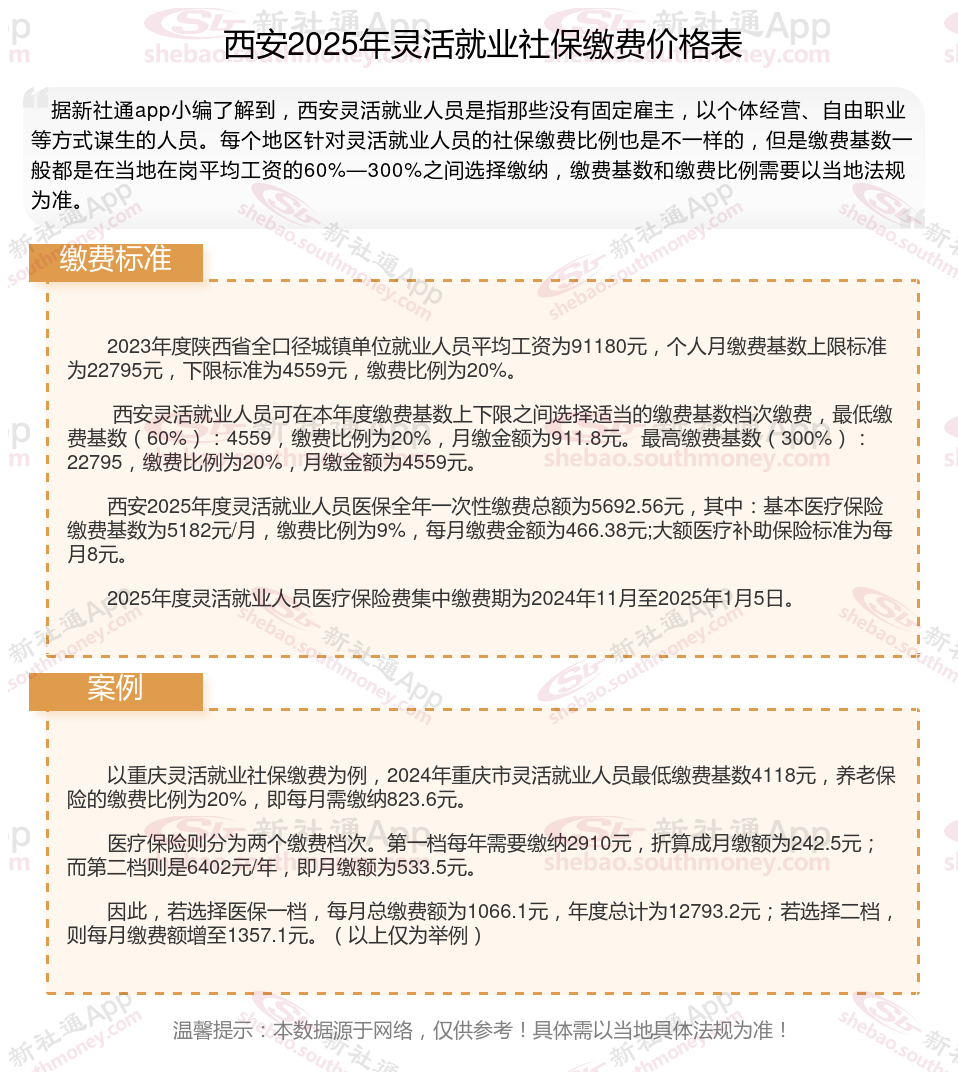 随着经济社会的不断发展,灵活就业群体不断地日益壮大,其社保缴费问题也愈发受到关注。那么2025年西安灵活就业人员社保交多少钱,你了解2025年西安灵活就业人员社保缴费基数及比例吗,接下来随新社通APP小编一起来看看。