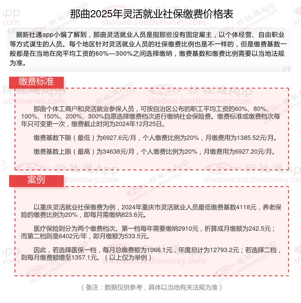 随着经济的发展和社会的进步,灵活就业人员越来越多,但是很多人不知道如何缴纳社保。本文将介绍2025年那曲灵活就业人员社保缴费基数及如何缴纳社保,能领取多少钱,帮助大家更好地了解灵活就业社保,随着新社通APP小编一起了解那曲灵活就业社保缴费最新资讯吧。