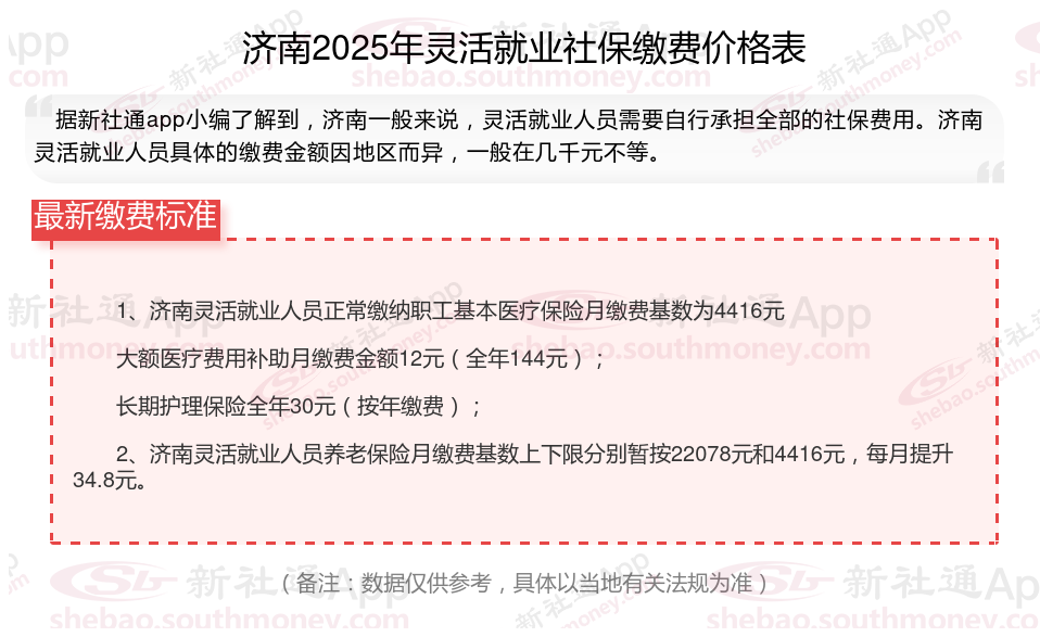 灵活就业社保通常只需缴纳养老和医疗两项(部分地区可自愿选缴失业险),其他险种无需强制缴纳。灵活就业社保缴费满15年后,退休后可领取养老金,避免老年无收入来源。接下来随社保君了解一下2025年济南灵活就业人员社保交多少钱,2025年济南灵活就业社保缴费标准的详细内容。