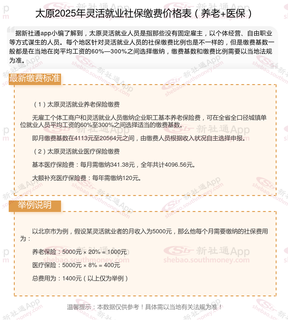 随着经济社会的不断发展,灵活就业群体不断地日益壮大,其社保缴费问题也愈发受到关注。那么2025年太原灵活就业人员社保交多少钱,你了解2025年太原灵活就业人员社保缴费基数及比例吗,接下来随新社通APP小编一起来看看。