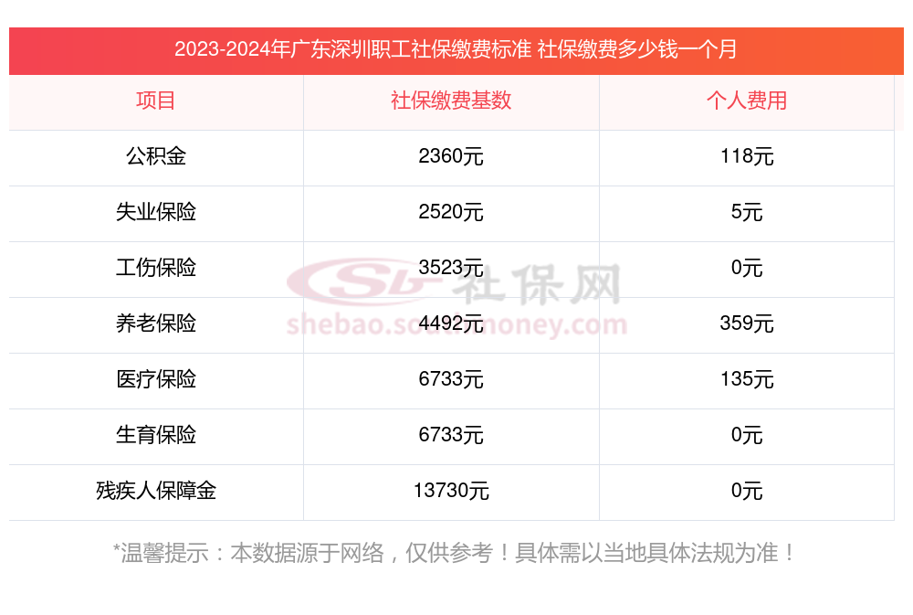 一、广东深圳职工社保缴费基数是多少钱一个月?职工社保缴纳标准最新如下: