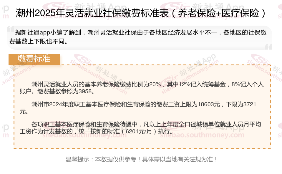 提示:潮州灵活就业人员每个月的缴费压力还是比较大的,每个月的社保费用都是千元,缴费档次越高,灵活就业人员要缴纳的费用也越多。