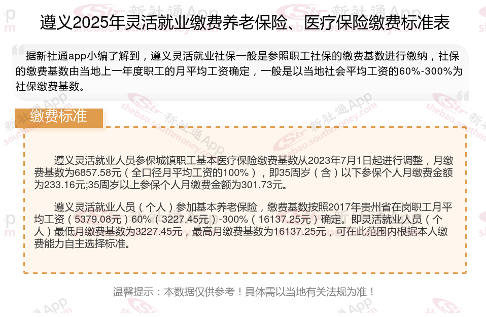 以上就是带来遵义灵活就业社保缴费标准相关知识,内容供参考,希望对你有帮助,欢迎关注/下载新社通app解锁更多社保专业资讯。