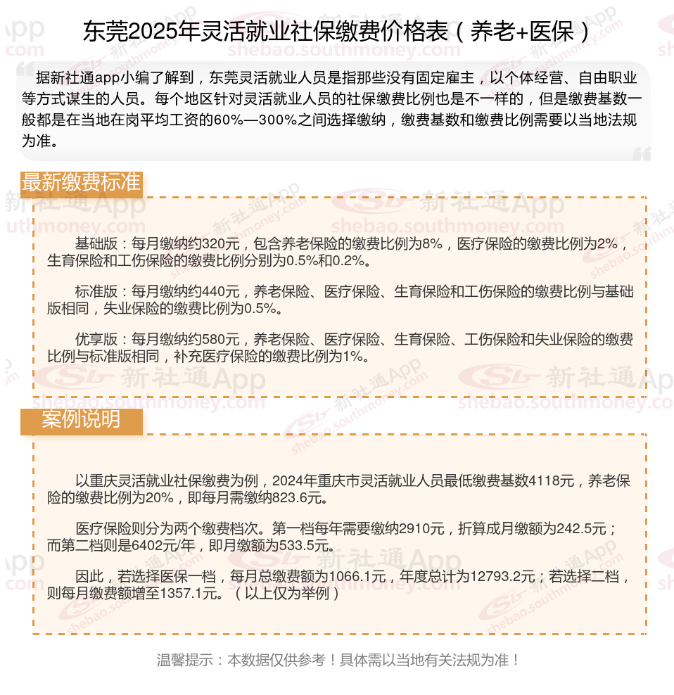 以上就是带来东莞灵活就业社保缴费标准相关知识,内容及数据仅供参考,希望对你有帮助,欢迎关注/下载新社通app解锁更多社保专业资讯。