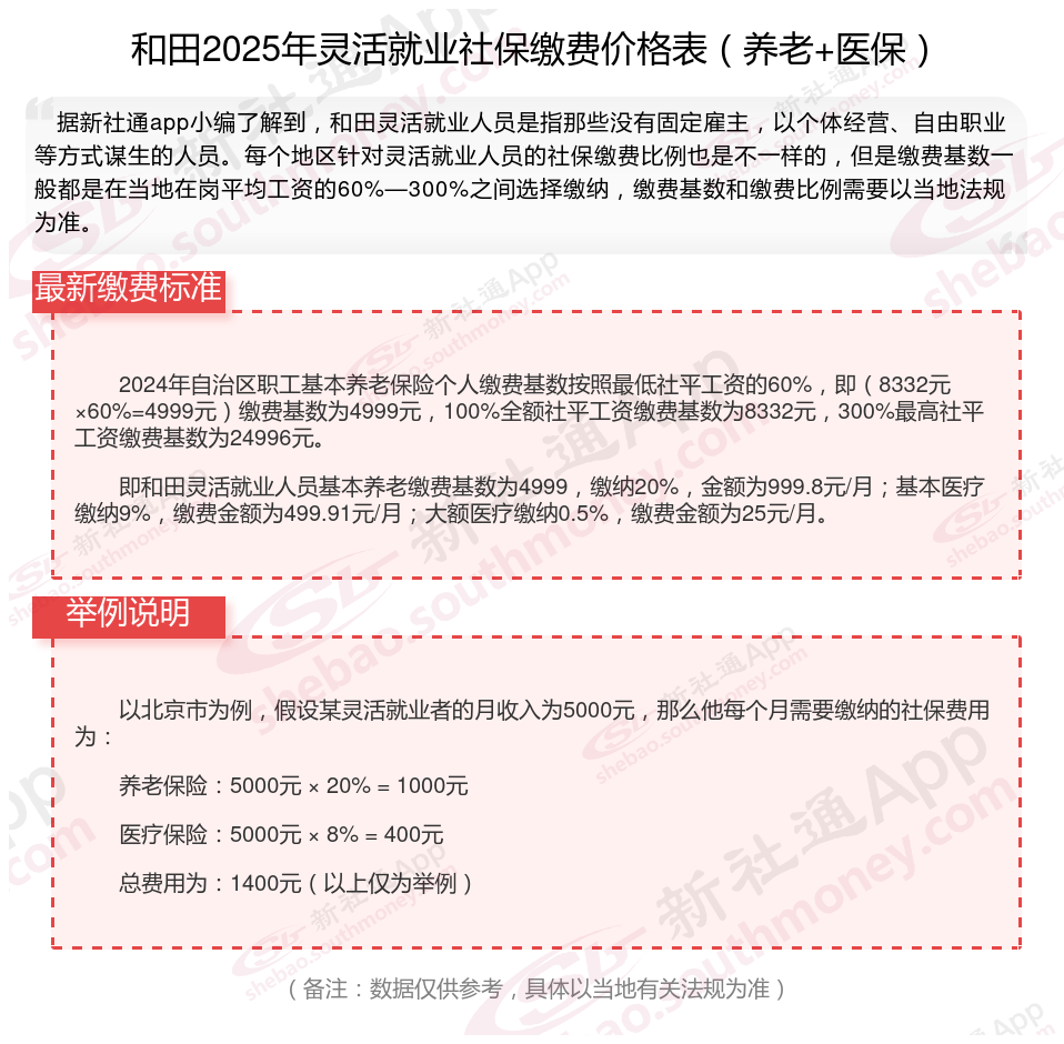 2025灵活就业社保缴费标准的调整,既体现了法规的连续性,又适应了经济社会发展的要求。灵活就业人员应根据自身情况,合理选择缴费基数和缴费比例,确保自身权益得到充分保证。那么2025年和田灵活就业人员社保需要交多少钱?下面随新社通小编一起来看看。