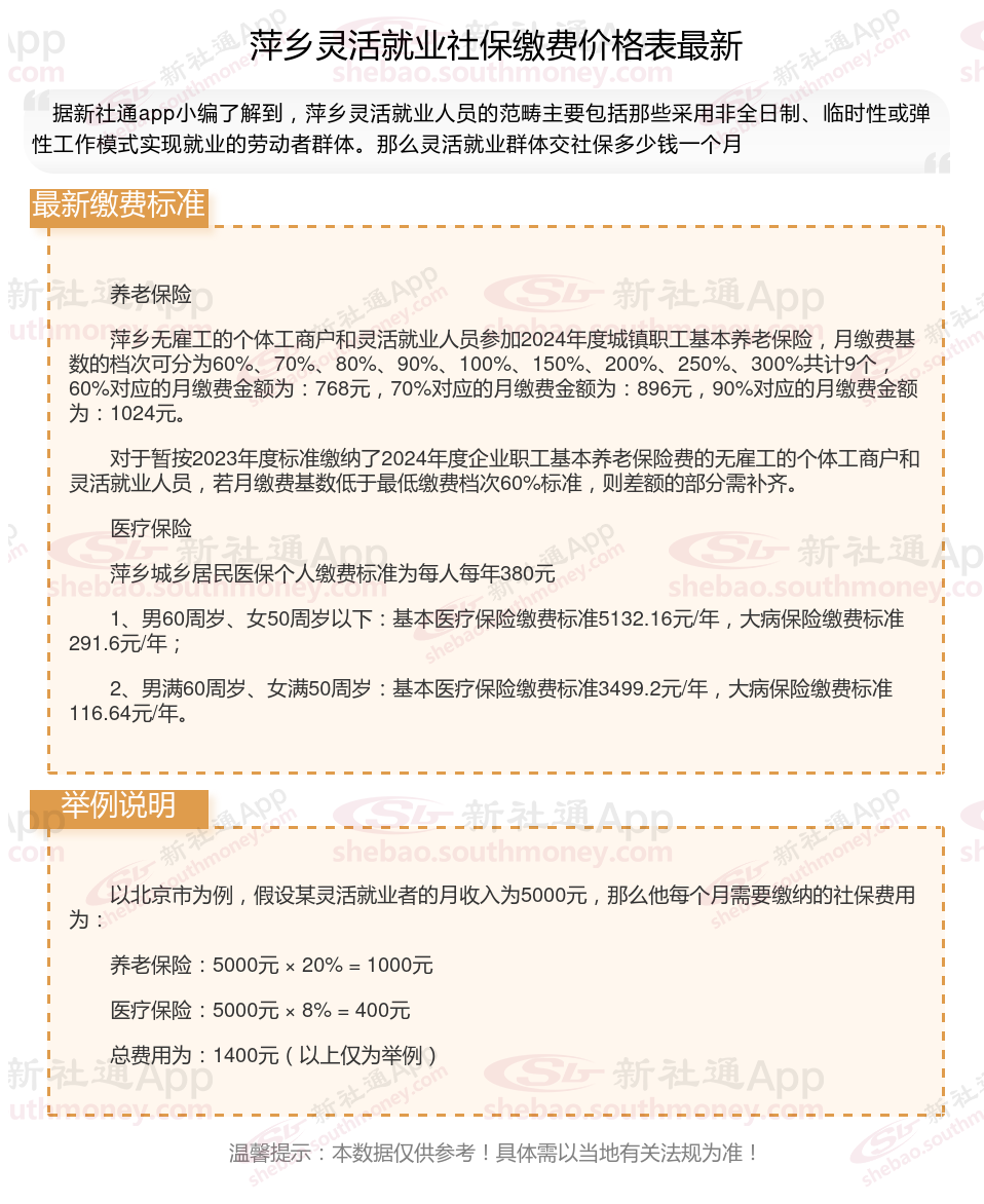 以上就是带来萍乡灵活就业社保缴费标准相关知识,内容供参考,希望对你有帮助,欢迎关注/下载新社通app解锁更多社保专业资讯。