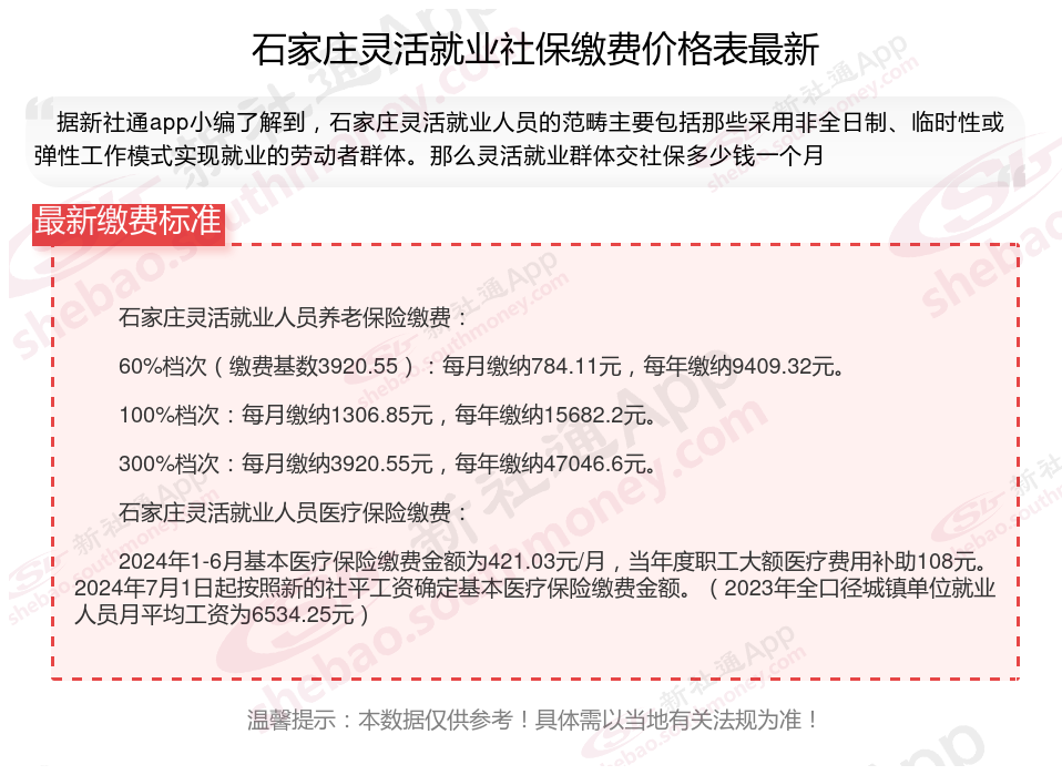 一、2024-2025年石家庄灵活就业社保缴费标准表 石家庄灵活就业社保多少钱一个月?
