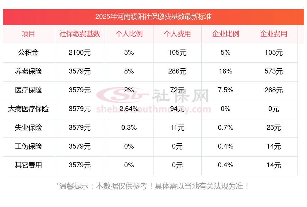 2025河南濮阳社保个人缴费最低标准!河南濮阳社保交多少钱?据新社通app获悉:河南濮阳企业职工社保缴费基数为:3579.00元。