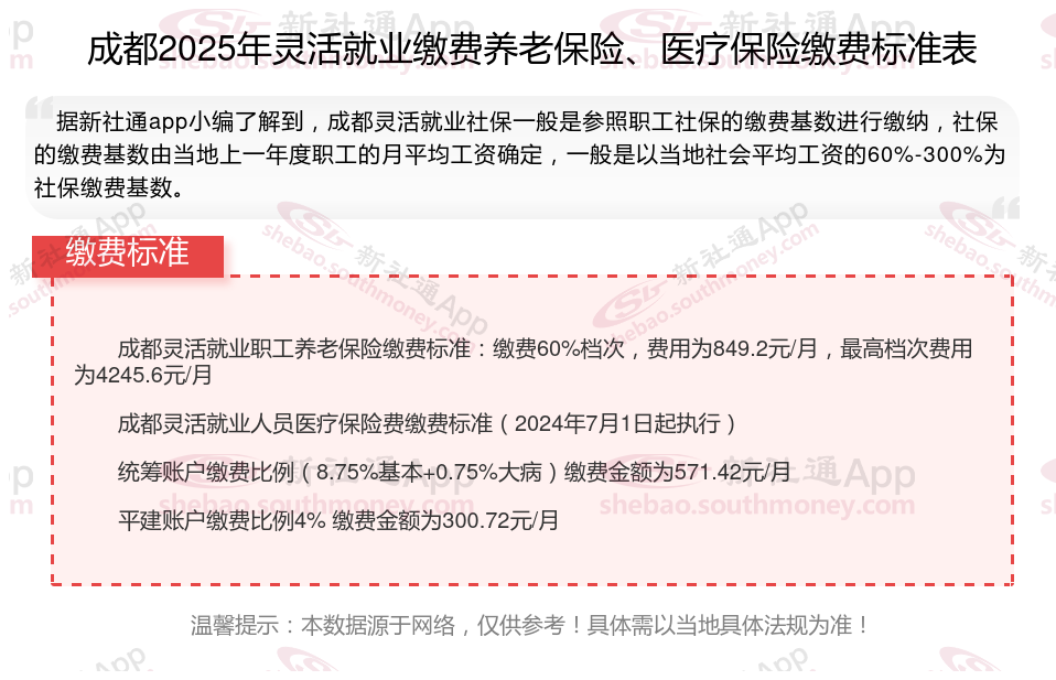 随着经济的发展和社会的进步,灵活就业人员越来越多,但是很多人不知道如何缴纳社保。本文将介绍2025年成都灵活就业人员社保缴费基数及如何缴纳社保,能领取多少钱,帮助大家更好地了解灵活就业社保,随着新社通APP小编一起了解成都灵活就业社保缴费最新资讯吧。