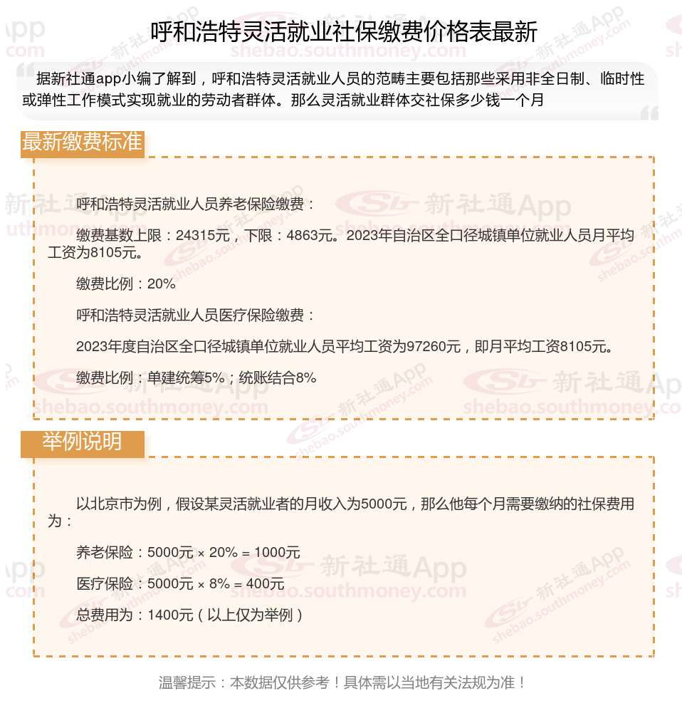 呼和浩特灵活就业社保2025年收费标准是多少钱,主要由当地的在岗平均工资和缴费基数来定。其次,灵活就业社保缴纳跟职工缴纳不同的地方在于,灵活就业社保参保只能参保养老保险和医疗保险,且缴纳比例完全由个人承担。另外,灵活就业人员社保参保选择,可自由选择参保城镇职工社保和城乡居民保险。2025年呼和浩特灵活就业社保缴多少钱?如何缴纳?怎么计算待遇?新社通APP小编将在下文为您详细说明。