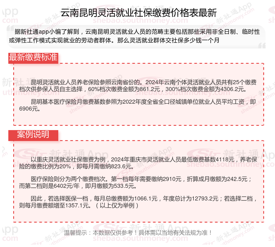 以上就是云南昆明灵活就业社保缴费的全部内容,数据及内容供参考!希望对你有帮助,欢迎关注新社通解锁更多社保专业资讯。